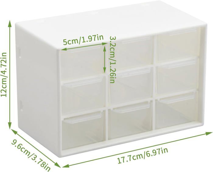 Parfait pour ranger tous tes petits objets ! Ces 2 boîtes transparentes ont chacune 9 tiroirs amovibles. En plastique HIPS résistant, elles sont empilables, étanches à la poussière, et les tiroirs coulissent bien. Idéal pour le bureau (stylos, trombones), les cosmétiques, les outils de bricolage, ou les loisirs créatifs. Dimensions : 18x11,7x9,7 cm par tiroir. Design blanc ou rose, pratique et organisé !