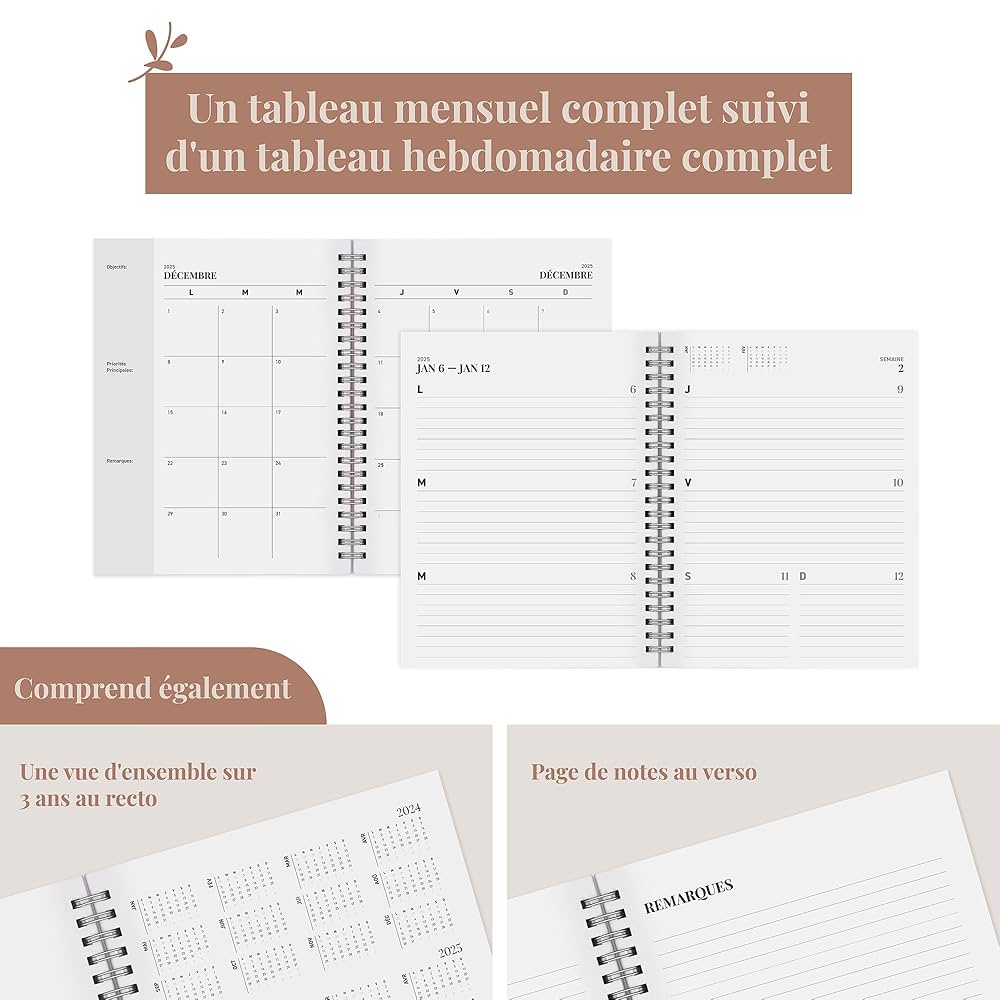 Cet agenda Rileys & Co 2025, c'est ton meilleur allié pour être organisé ! Format 20,3x15,2cm (8x6 pouces), reliure spirale pour qu'il reste à plat. Papier qualité supérieure sans transpercement. Pages mensuelles et hebdomadaires, calendrier triennal (jusqu'en 2027), jours fériés, et pages de notes. Design typographique trendy, léger et portable. Parfait pour les pros, les étudiants, ou les parents débordés. Existe en plusieurs couleurs. Démarre 2025 du bon pied avec un planning clair et stylé !