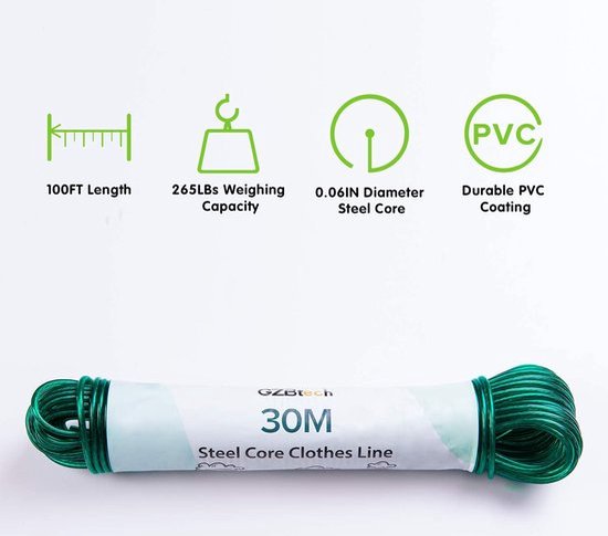Ta corde à linge classique lâche toujours ? Passe à l'étape supérieure avec cette corde à linge E-RFSEY ! Noyau en acier (7 brins) pour une charge max de 220kg - yes, même les couettes lourdes tiennent. Gainée en PVC imperméable et anti-rouille, donc pas de traces sur le linge. Longueur 30m, diamètre 4mm, tu peux la couper à ta guise (pince conseillée). Parfaite pour balcon, terrasse, jardin, camping... Et en plus, tu peux l'utiliser comme câble de support pour plantes ou guirlandes. Pratique, durable, et vraiment costaud !