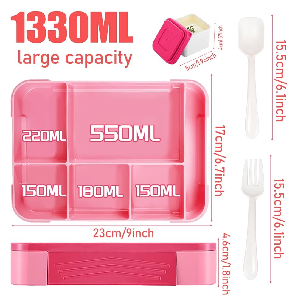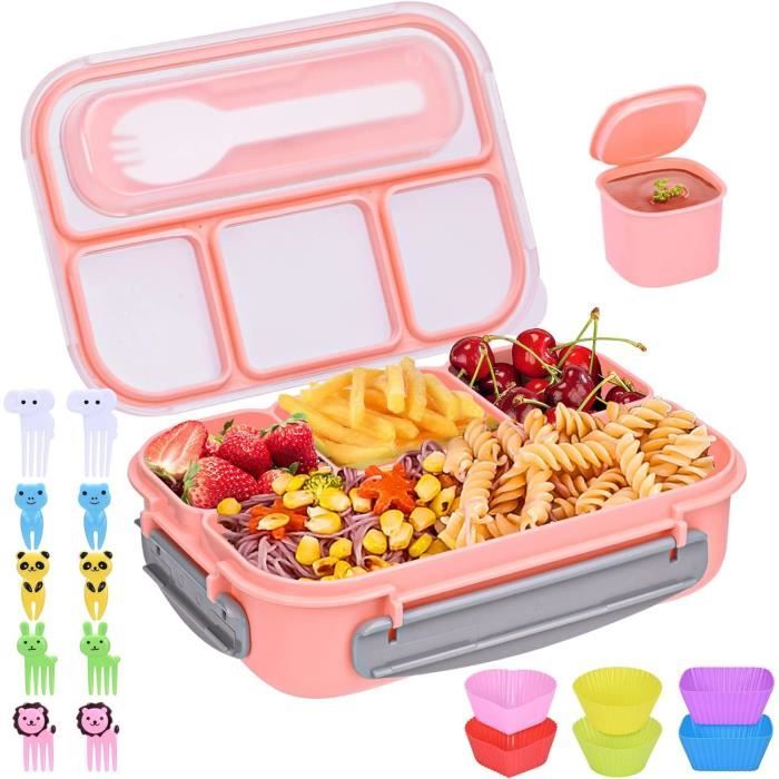 Cette lunch box bento PUWOWYE est géniale pour emporter tes repas ! Avec ses 1330ml de capacité et ses 5 compartiments, tu peux tout séparer : plat principal, fruits, snacks, sauces... Le système étanche en silicone garde tout bien frais et évite les fuites. Les 4 loquets sont faciles à ouvrir même pour les petites mains. En plastique sans BPA, elle passe au micro-ondes (sans couvercle), au frigo et au lave-vaisselle. Fourchette, cuillère et pot à sauce inclus ! Parfaite pour l'école, le bureau, les pique-niques... Un cadeau pratique et sain pour toute la famille !