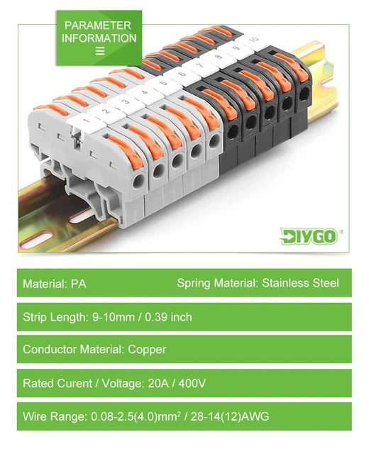 Parfait pour organiser ton tableau électrique ! Ce kit inclut 10 borniers orange (50A, 600V), un rail DIN, des barres de connexion (2P à 5P), une bande de repère vierge, et des clips de fixation. En plastique ignifuge PA66, ils acceptent des fils de 0.5-6mm² (rigides) ou 0.5-4mm² (souples). Le câblage est rapide et secure, avec une longueur de dénudage recommandée de 12mm. Idéal pour les armoires électriques, les automates, ou les projets DIY. Montage easy sur rail DIN – ça snap en deux secondes. Un must pour les électriciens et bricoleurs avertis !