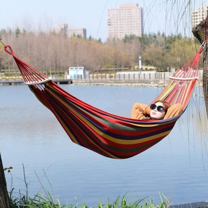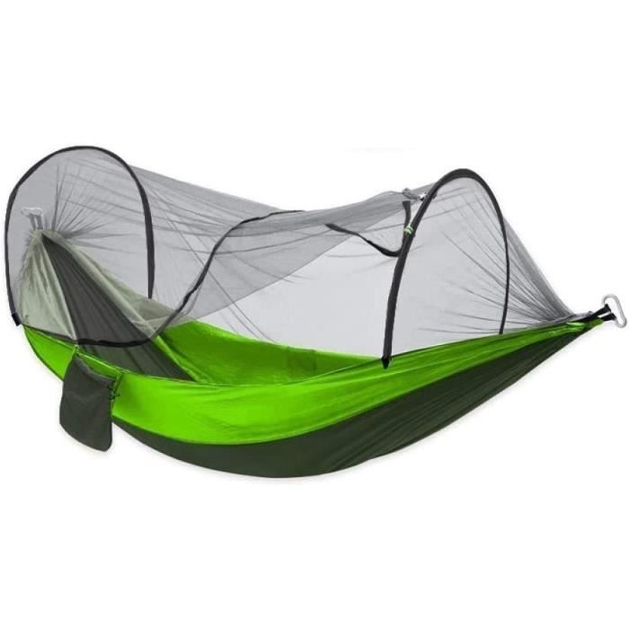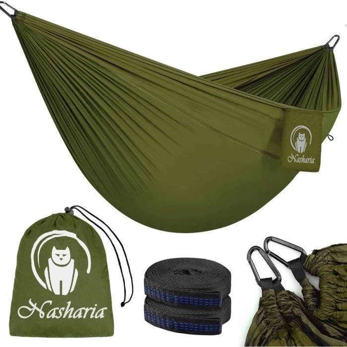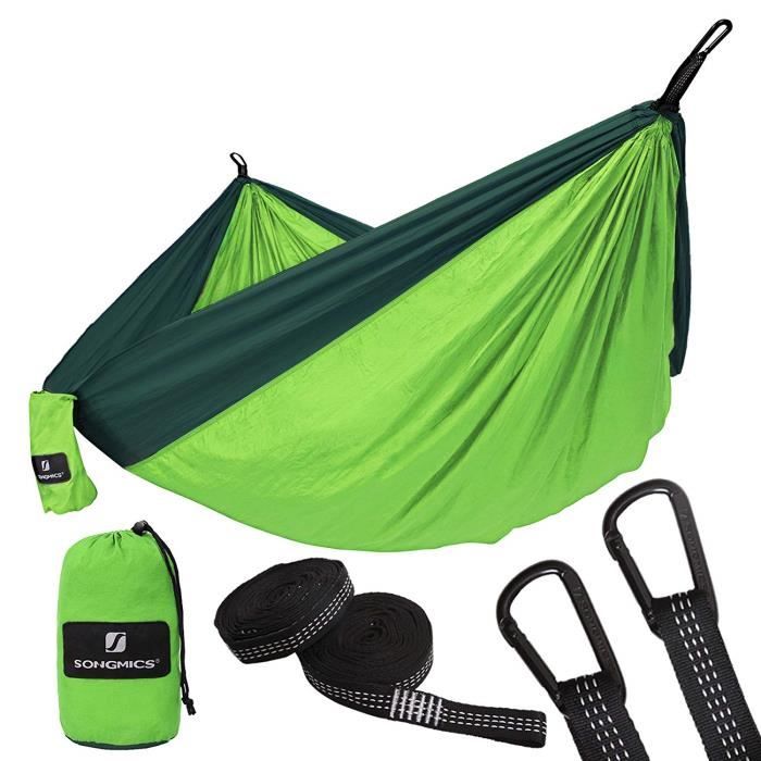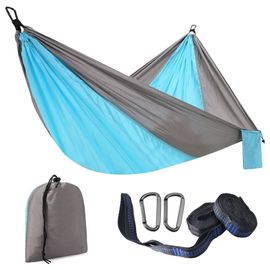 Détente nature garantie ! Ce hamac en nylon 210T supporte jusqu'à 300kg pour deux personnes (275x140cm). Ultra-léger (550g) et compact une fois plié. Inclus 2 mousquetons et 2 sangles pour l'accrocher facilement entre deux arbres. Triple couture pour une durabilité maximale. Parfait pour le camping, la randonnée ou le jardin. Séchage rapide et résistant à la moisissure. Livré avec un sac de rangement. Attention : toujours vérifier la solidité des points d'attache !