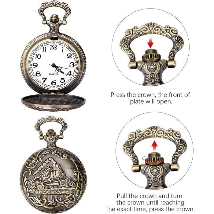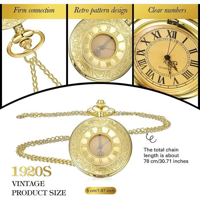 Cette montre gousset vintage a un charme intemporel qui plaît autant aux hommes qu'aux femmes ! Avec son cadran argenté aux chiffres romains et ses motifs floraux gravés, elle est à la fois élégante et romantique. Le mouvement quartz est précis et fiable, et le boîtier en alliage (47mm) est léger mais solide. La chaîne incluse permet de la porter à la ceinture, dans une poche de gilet, ou même en collier. Pour l'ouvrir, appuie juste sur le bouton supérieur – et utilise la couronne pour régler l'heure. Parfaite pour les mariages, les cérémonies, ou comme cadeau original pour un anniversaire. Si tu aimes le style rétro et les accessoires unique, cette montre est pour toi !