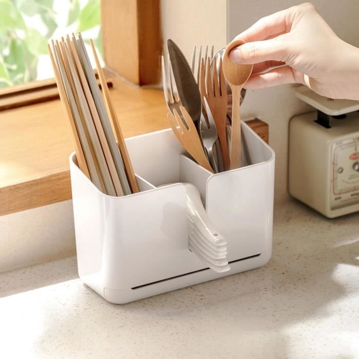 Ce petit porte-ustensiles trop mimi est LA solution maligne pour ranger tous tes couverts sans prendre de place ! Sa base en bois naturel lui donne un style rustique et moderne à la fois, ce qui va trop bien avec n'importe quel style de cuisine. Tu peux y mettre tes fourchettes, cuillères, baguettes et même tes petits ustensiles - tout tient parfaitement dans ce rangement compact. En plus, il permet à l'eau de s'égoutter donc plus de problème d'humidité ! Fini les tiroirs en bazar où on trouve jamais ce qu'on cherche. Nettoyage ultra facile : un coup d'éponge et c'est propre. Parfait pour les petites cuisines ou pour gagner de la place sur le plan de travail. Dimensions : 18,6 x 12 x 9,3 cm, en polypropylène et pin. Poids : 315 g. Livré avec 1 support. Vraiment pratique au quotidien !