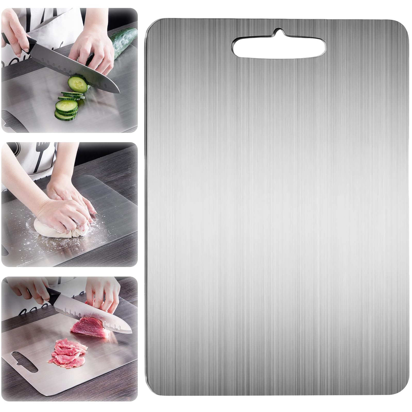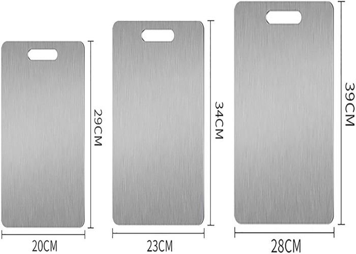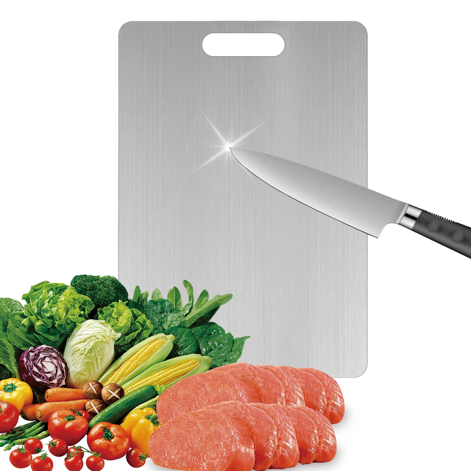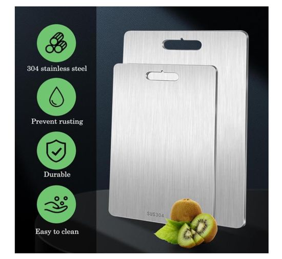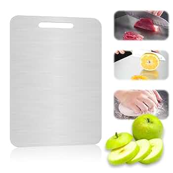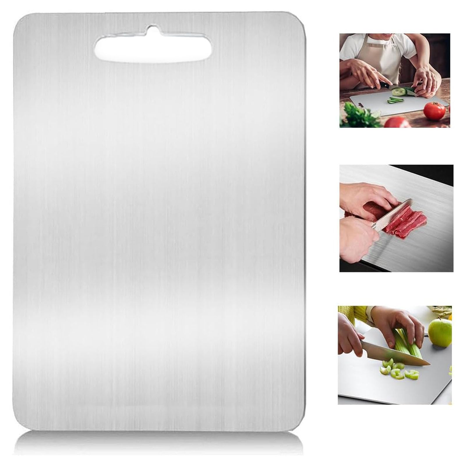 Cette planche à découper en titane est une révolution en cuisine ! Double face : une pour légumes/fruits, l'autre pour viande. En acier inoxydable alimentaire, facile à laver, sans odeur ni moisissure. Protège tes couteaux et prend peu de place. Dimensions 34x23cm, durable et hygiénique. Finis les planches en bois qui s'abîment - passe au métal !
