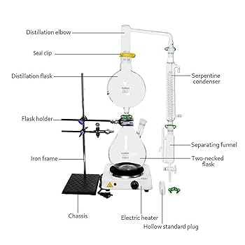 Pour les passionnés de chimie ou les producteurs d'huiles essentielles, ce kit de distillation est complet et pro. Il inclut une fiole 1000ml en verre borosilicate 3.3, un condenseur Graham 300mm, un chauffage 1500W, et tout le nécessaire pour distiller, purifier, ou séparer des mélanges. Parfait pour les labos maison ou les petits projets. Attention à bien respecter les consignes de sécurité (niveau de liquide, température). Garantie 1 an et support vidéo inclus. Si tu aimes bidouiller, ce kit est pour toi !