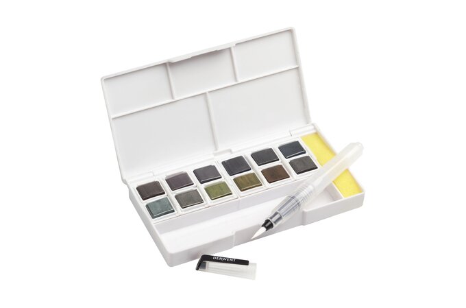 Cette palette Graphitint Derwent est géniale pour les croquis ! Avec 12 pastilles de peinture graphite aux tons neutres (bleu océan, vert prairie, brun automne...), elle combine la précision du graphite et la douceur de l'aquarelle. Ajoute de l'eau pour révéler les couleurs. Le set inclut un pinceau waterbrush, une éponge et 5 palettes de mélange. Parfait pour les paysages, croquis urbains ou les œuvres mixtes. Qualité pro, idéal en voyage ou en atelier. Les fans de dessin vont adorer !