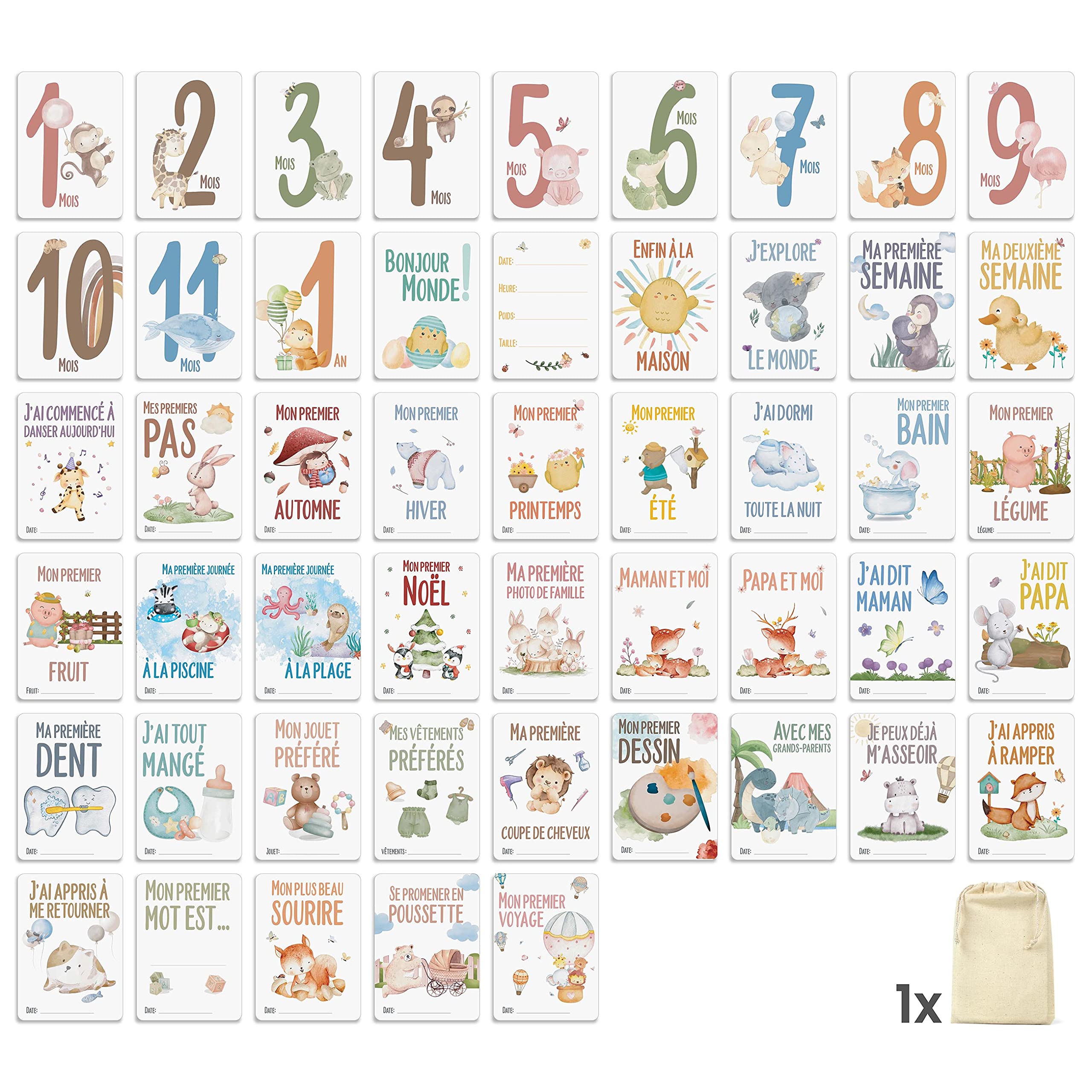 Pour immortaliser chaque moment de bébé ! Ce set de 46 cartes t'aide à suivre mois par mois les progrès de ton petit : première dent, premier bain, premier Noël… Les cartes sont en carton épais (300g/m²), neutres et super mignonnes. Format A6 (10,5x14,8cm), avec une boîte de rangement élégante. En plus, tu reçois un bon de 7€ pour développer tes photos. Idéal comme cadeau de baby shower, de naissance ou pour offrir à une jeune maman. Plus d'excuses pour oublier ces précieux souvenirs – tout est organisé et joliment présenté. Fini le temps qui passe trop vite !