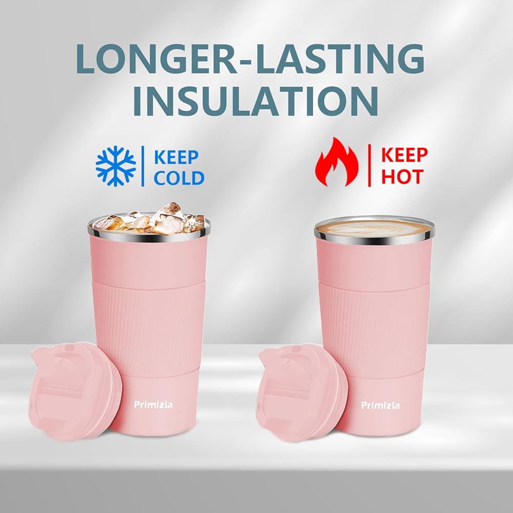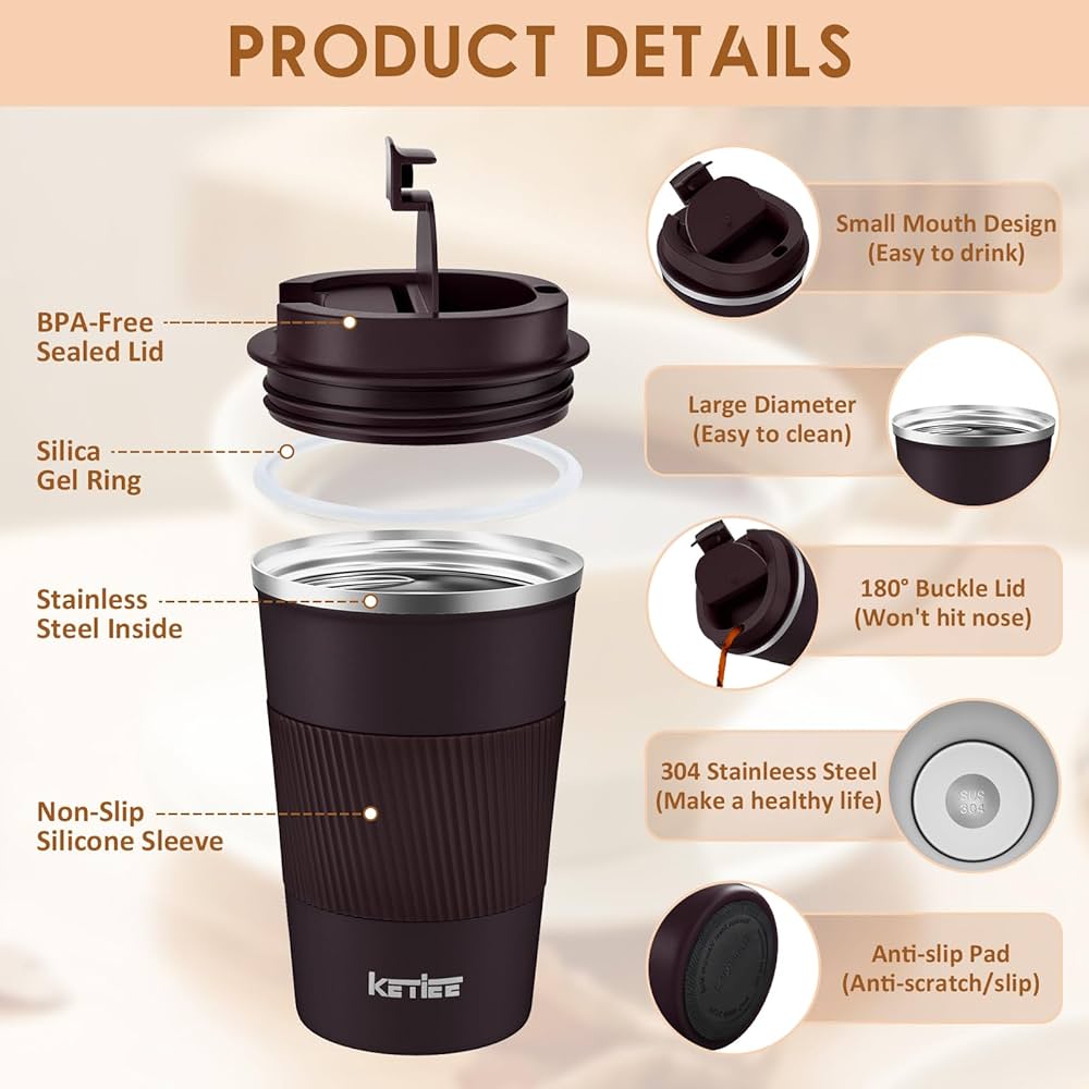 Cette tasse isotherme KETIEE est parfaite pour emporter ton café, thé ou boisson favorite partout ! D'une capacité de 510ml (il existe aussi en 380ml), elle garde tes boissons chaudes ou froides pendant 6 heures grâce à sa double paroi isolante. En acier inoxydable 304 et sans BPA, elle est sûre et sans odeur. Le couvercle à vis est étanche (testé à 360°), avec un joint en silicone, et une base antidérapante protège tes meubles. Design compact pour les porte-gobelets standard, et facile à nettoyer. Disponible en rose et autres coloris, c'est un cadeau idéal !