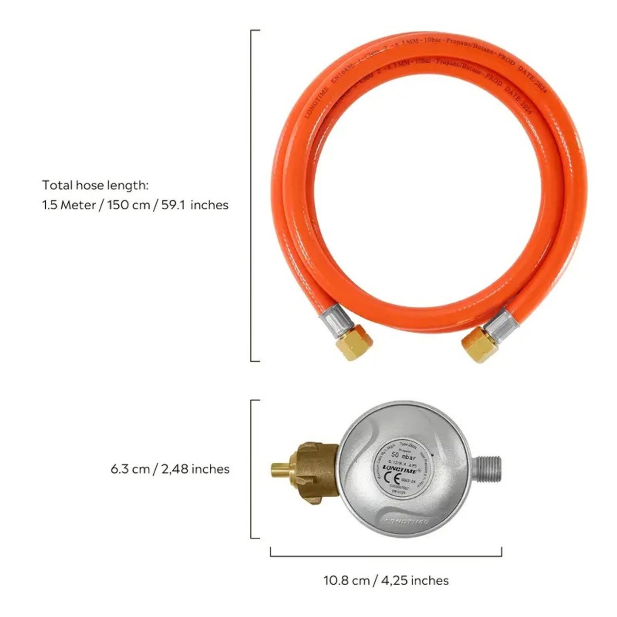 Pour tes barbecues, chauffages d'extérieur ou réchauds, ce kit régulateur + tuyau gaz est essential ! 🔥⛺ Le régulateur baisse la pression à 50 mbar (entrée max 16 bar) et le tuyau de 150 cm résiste jusqu'à -30°C - parfait pour l'hiver. Compatible avec les bouteilles de gaz standard de 3, 5 et 11 kg (filetage gauche 1/4). Le tuyau a un numéro test DIN-DVGW pour assurer la sécurité. Utilise-le sur ton barbecue à gaz, ton chauffage de terrasse, ton réchaud de camping ou ta lampe. Le débit max est de 1,5 kg/h. Conforme à la norme EN16129 pour un usage domestique safe. Attention : usage extérieur seulement ! Les régulateurs vieillissent, donc pense à les remplacer régulièrement. Installation easy : visse le régulateur sur la bouteille et connecte le tuyau à ton appareil. Fini les soucis de pression irrégulière ou de fuites. Un kit fiable et abordable pour profiter de ton matos gaz en toute tranquillité. Parfait pour les weekends en famille ou les soirées entre amis. Safety first !