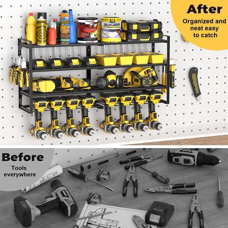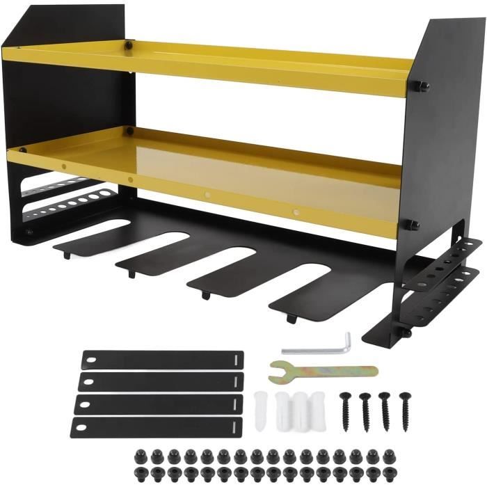 Range ton garage comme un pro avec cet organisateur mural ! Il a 4 niveaux : le bas pour 8 perceuses sans fil, et les 3 étages du haut pour tes autres outils lourds ou petits accessoires. En acier épais, il supporte jusqu'à 70kg (selon ton mur). Dimensions : 84cm de long, 20cm de large, 39.5cm de haut. Montage simple avec les vis fournies. Parfait pour les ateliers, garages, ou même les camionnettes. Fini le bordel, tout est à portée de main !