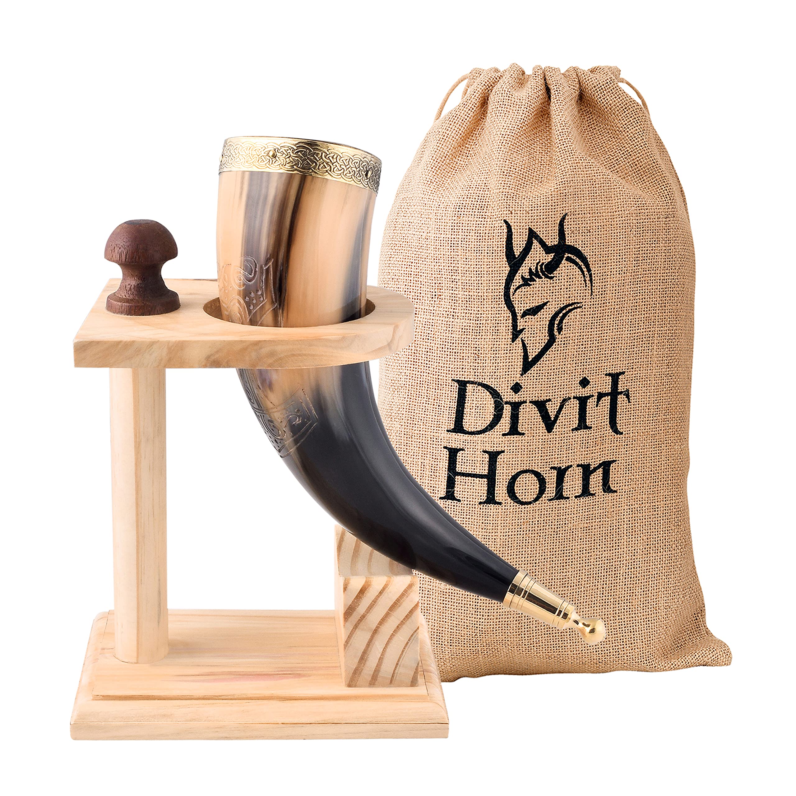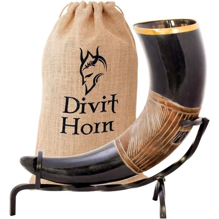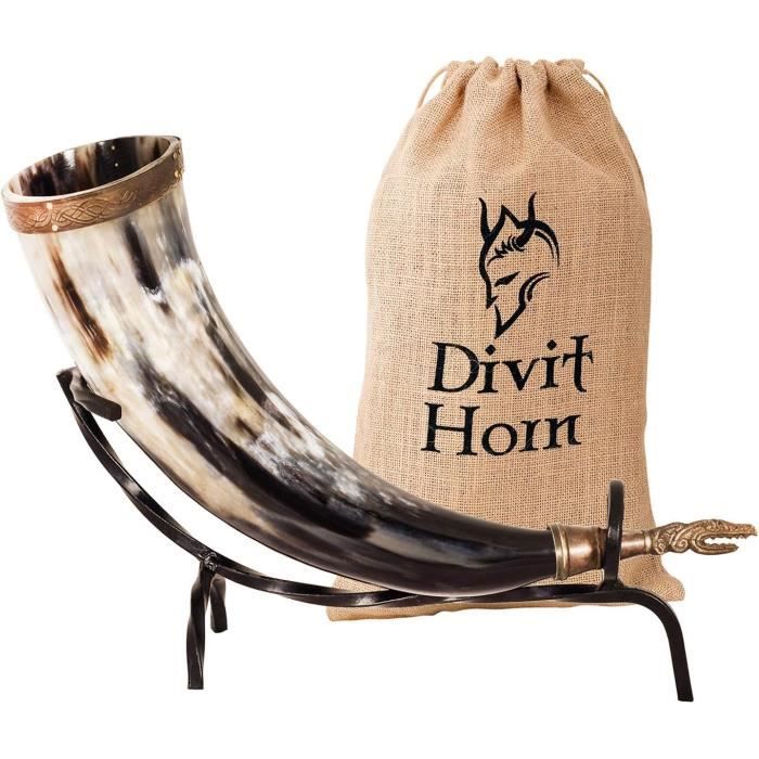 Prêt à boire comme un vrai Viking ? Cette corne à boire authentique en corne de bœuf contient 16oz (400ml) et vient avec son support en fer et un sac en toile de jute. Finition laiton et vernis alimentaire à l'intérieur, donc safe pour les boissons. Chaque pièce est unique - taille et couleur varient naturellement. Parfaite pour les fêtes à thème, les cadeaux d'anniversaire originaux, ou comme déco médiévale. Attention, c'est du solide ! Livraison avec garantie satisfaction. Si tu veux impressionner tes potes lors d'un festin, c'est l'accessoire qu'il te faut. Skål !