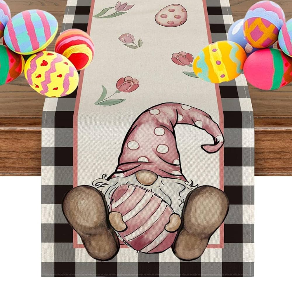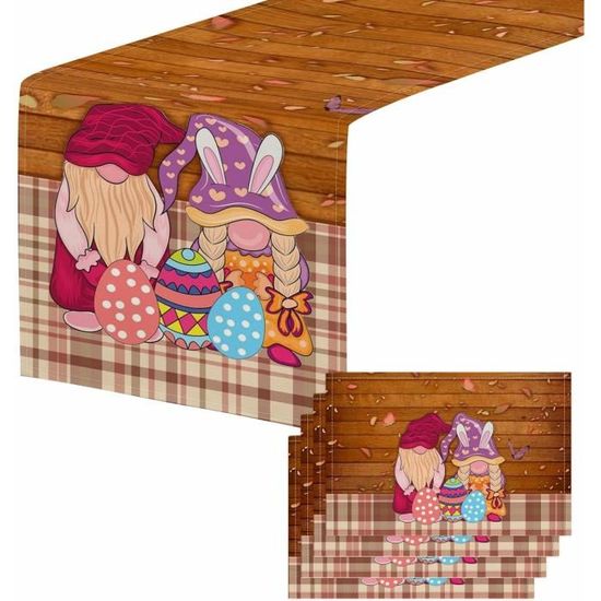 Prêt à donner un coup de pep’s printanier à ta table pour Pâques ? Ce chemin de table en lin avec ses motifs trop mignons de lapins, d’œufs colorés et de fleurs va transformer ton repas en véritable fête ! \n\nAvec ses 33x180cm, il s’adapte sur la plupart des tables – cuisine, salle à manger, buffet, ou même sur une commode pour une déco d’ambiance. Le tissu est en lin solide et doux, imprimé uniquement sur le recto pour un rendu classe et durable. Il protège aussi la table des taches et de la chaleur des plats – pratique et joli, quoi. \n\nLavable en machine à froid (oui, même après les éclaboussures de chocolat), il sèche vite et se repasse facilement si t’es maniaque. Tu peux l’utiliser année après année – c’est eco-friendly et économique ! \n\nQue ce soit pour un brunch de Pâques en famille, une décoration de table pour la chasse aux œufs, ou juste pour ajouter une touche de gaieté dans la maison, ce chemin de table est un must-have. Et si tu cherches un cadeau sympa pour un ami qui aime décorer, c’est une valeur sûre. Printemps, joie, et convivialité garanties !