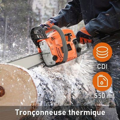 Cette tronçonneuse à essence de 78cc est une bête de travail ! Avec son guide-chaîne de 20 pouces (50cm), elle coupe des arbres facilement. Moteur 2 temps, puissance 3.5CV, et réservoir de 550ml. Parfaite pour le jardin, la ferme, ou les travaux forestiers. Design ergonomique avec protection main. Livrée avec kit de réparation et outils. Attention : toujours utiliser avec équipement de sécurité !